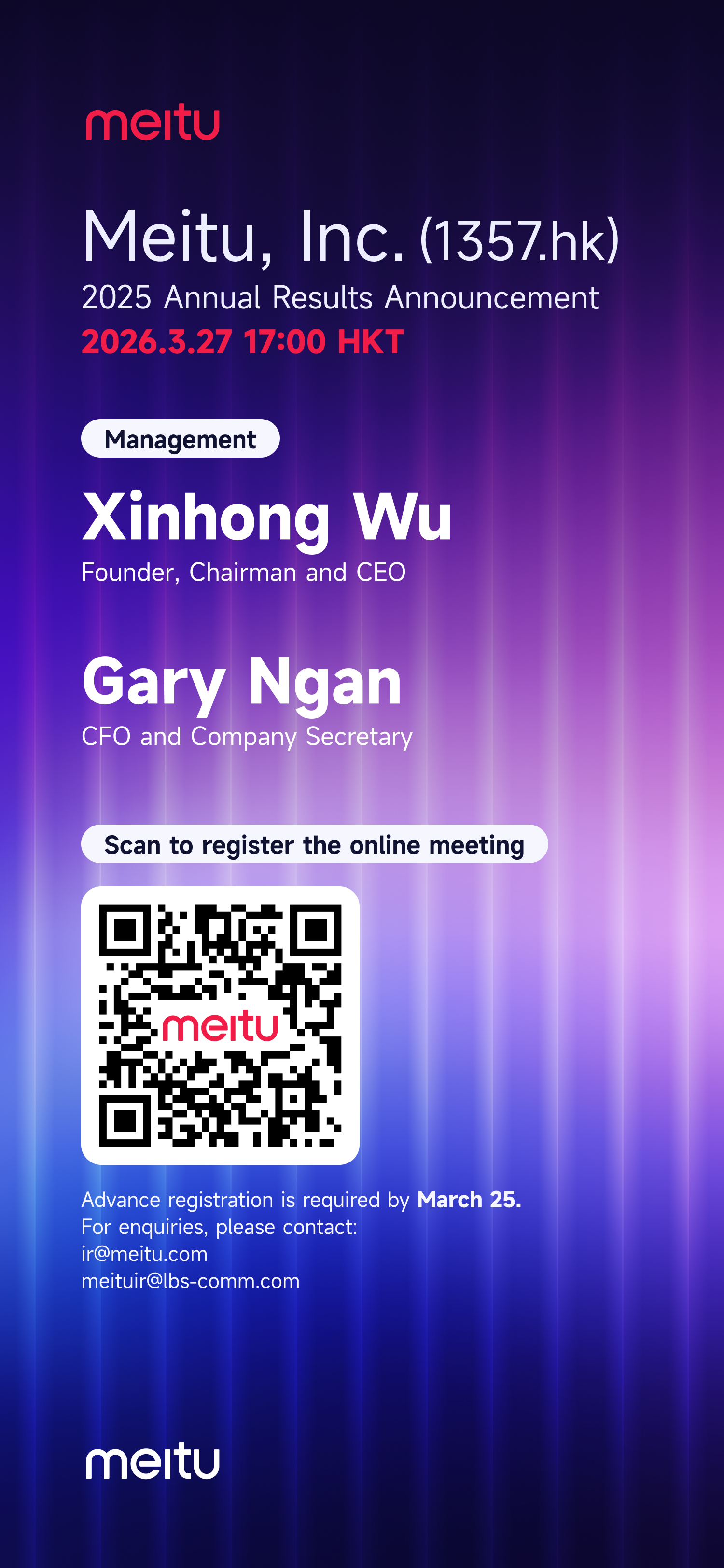 Disclaimer: Equity research analysts from the aforementioned brokerages have initiated coverage on Meitu with research reports. Any analysis, assessment, forecasts, and recommendations regarding Meitu contained in these reports represent the personal views of the analysts and do not represent the views of Meitu Inc. or its management. Meitu Inc. does not provide any guidance, hints, or reference opinions to the aforementioned analysts regarding their analysis, evaluation, forecasts, or recommendations.